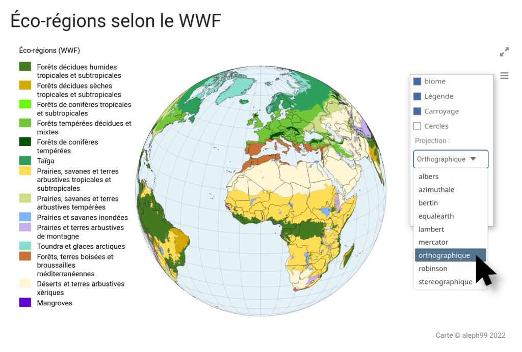 Une même carte peut prendre des formes radicalement différentes selon la projection utilisée. La Cartothèque propose neuf projections aux caractéristiques distinctes : Robinson, Equal Earth, Mercator, Bertin, Albers, Lambert, azimutale, orthographique et stéréographique. Chacune présente des avantages spécifiques et des biais de représentation.